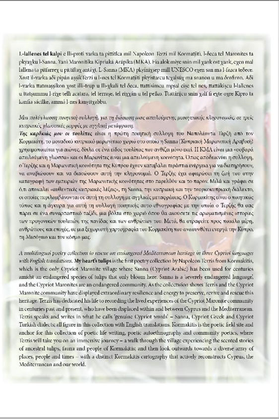 A multilingual poetry collection to rescue an endangered Mediterranean heritage written in Sanna and Greek with English and Turkish translations. Kormakitis, which is the only Maronite-Cypriot village where sanna is spoke, is the poetic field site and anchor for this collection of poetic life writing, autoethnography, and community poetics. Terzus will take you on an immersive journey – a walk through the village experiencing the scented stories of ancestral tulips, fauna and people of Kormakitis; and then look outwards to a diverse array of people, places and times – with a distinct Kormakitis cartography that actively reconstructs Cyprus, the Mediterranean and our World.