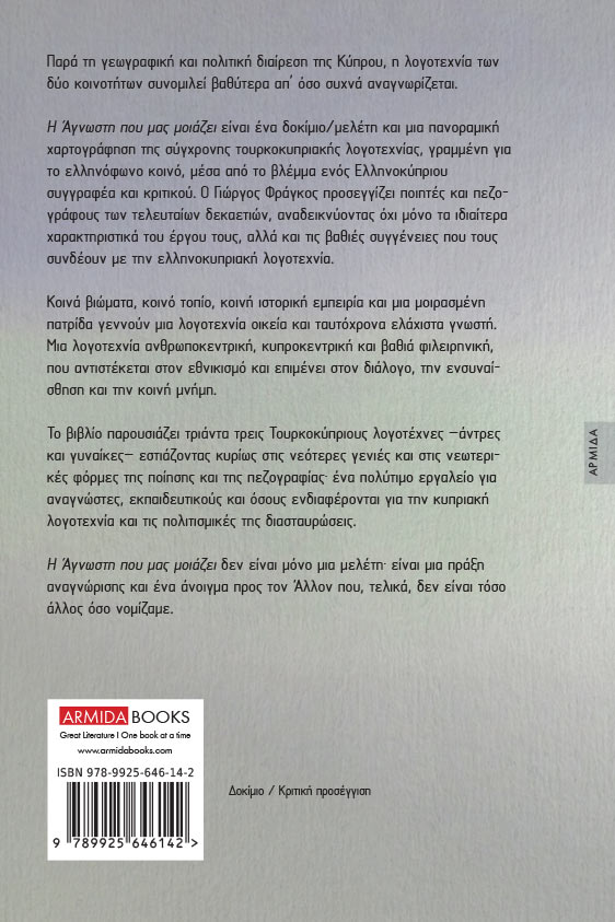 Η Άγνωστη που μας μοιάζει είναι ένα δοκίμιο/μελέτη και μια πανοραμική χαρτογράφηση της σύγχρονης τουρκοκυπριακής λογοτεχνίας, γραμμένη για το ελληνόφωνο κοινό, μέσα από το βλέμμα ενός Ελληνοκύπριου